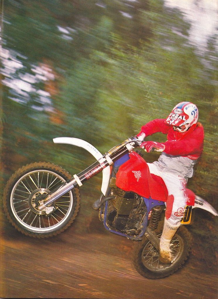 One disadvantage the ATK had over its two-stroke competition was weight. In ’89 the 604 came in two configurations, one with electric start, and one without. If you got the kickstart model, the bike weighed a slightly porky 247 pounds. If you ponied up the extra $1000 for the starter, that weight swelled to 262 pounds. That put the 604E in XR600R territory and a good 30 pounds heavier than any of the two-stroke 500s. Of course the tradeoff for the extra weight was that magic button and on a big four-stroke, that was no minor thing. Today’s 450s make starting a piece of cake, but in the eighties, starting a big thumper was no laughing matter. If you stalled a hot four-stroke you might end up kicking for an hour before the big beast would light. Overnight ATK negated the single biggest disadvantage thumpers had to their ring-ding competition.