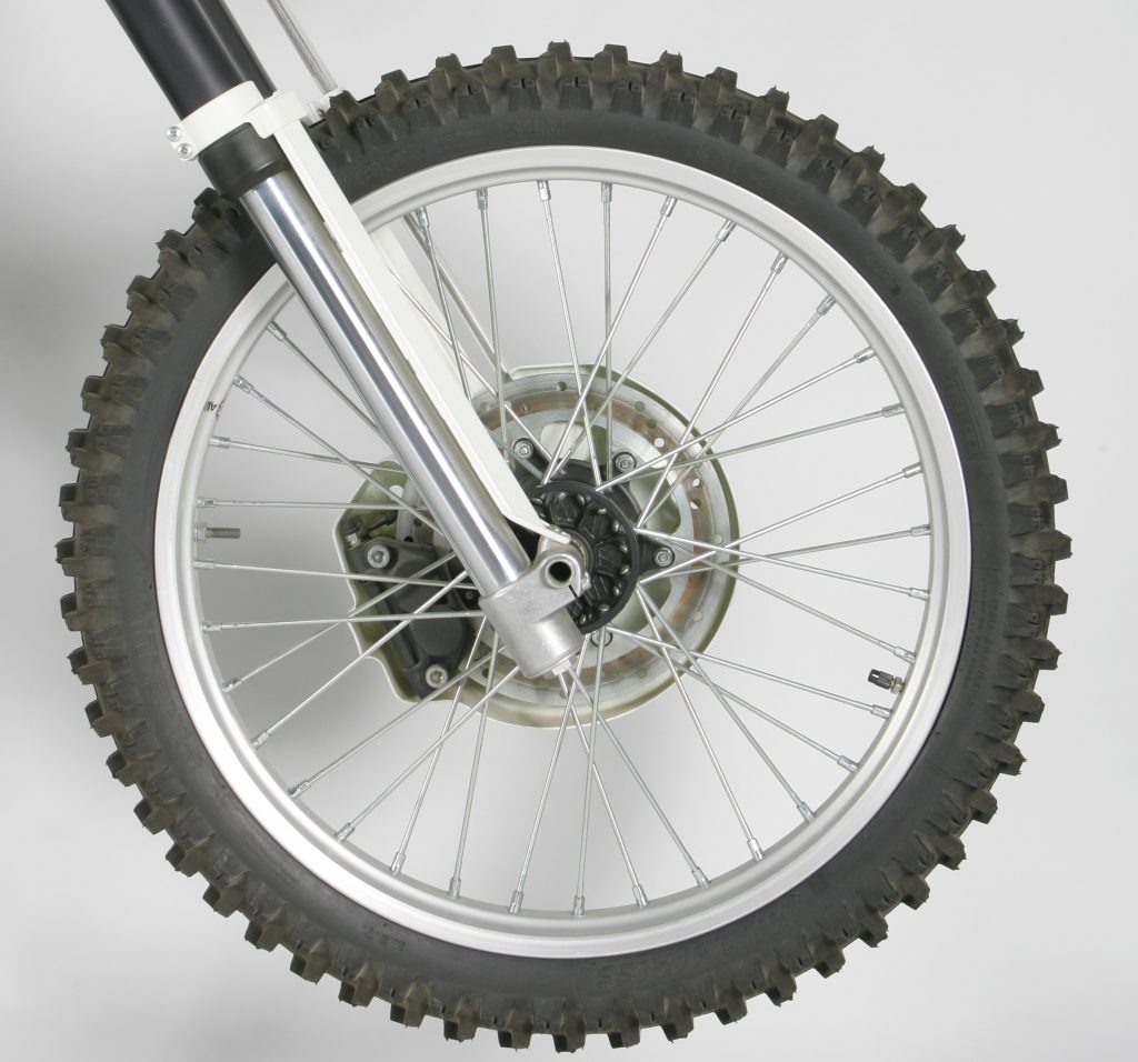 By removing the rotor from the rear wheel, ATK lowered the unsprung weight and reduced the brake’s torque-effect on the rear suspension. Together with the A-Trax, this helped give the ATK its supple suspension action and control. On the downside, however, the smaller disc was more prone to fading and offered less power than conventional designs. Because of the 604’s tremendous compression braking, however, this was less of a problem than it would have been on a two-stroke.
