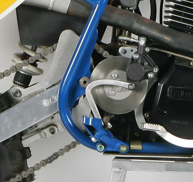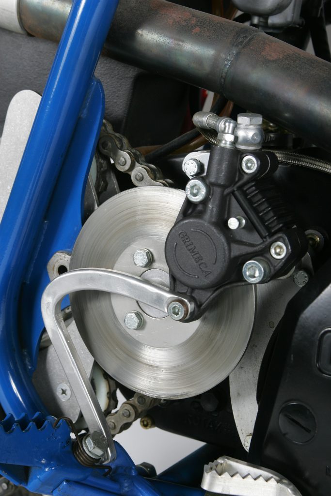 One of the strangest things about the 604 was its unique rear brake system. The rear disc on the ATK was mounted on the countershaft and actuated by a backward-facing pedal and under-the-tank master cylinder. Because of its positioning at the countershaft, the disc had to be significantly smaller than a traditional rear rotor. There were a couple of reasons for ATK’s innovative brake placement, both related to improving suspension action.