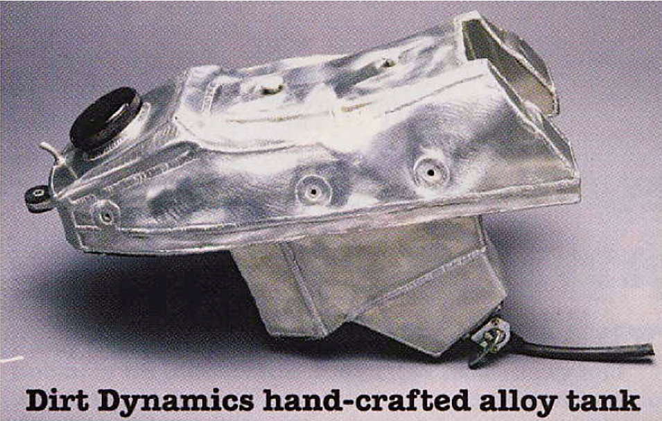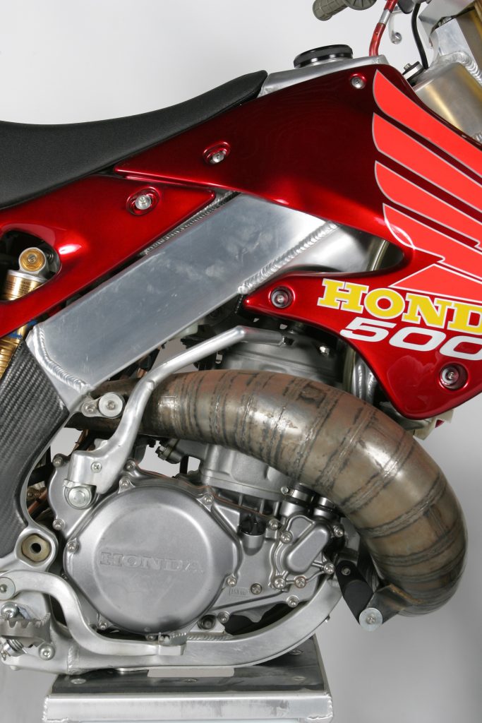 Primm’s CR500R project started out with a stock 1998 aluminum CR250R frame, swingarm and brakes. From there, they ordered a brand new ’98 CR500 motor to shoehorn into the frame. Special motor mounts and brackets had to be fabricated to wedge the massive Honda motor into the 250 frame, but otherwise, it was a good fit. The problem was, once the monster motor was in the Delta Box frame, it became pretty apparent nothing else would fit. Rick ended up having to build a special one-off aluminum tank for the CR that would hold enough fuel for the big-bore while still leaving room underneath for the required electronics.