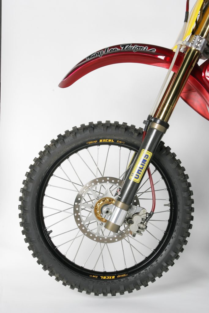Detailing on the Primm 500 was no less amazing than the rest of the bike. All the fasteners were titanium. The wheels were black Takasago Excel rims laced to trick Talon hubs. Braking oversized rotors were bolted to the wheels and mated to Fastline braided steel lines. Handlebars were lightweight titanium units with Renthal grips. MXA (the seat company not the magazine) provided the custom gripper seat and Acerbis handled the plastic.