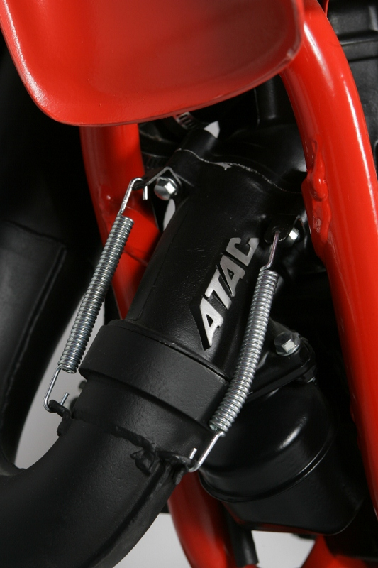 | The ATAC system consisted of a small chamber bolted to the bottom of the exhaust manifold and a small butterfly valve used to control exhaust flow. A centrifugally activated ball governor was employed to open and close the valve based on engine RPM. The theory behind it was to simulate two different expansion chamber profiles with one pipe. At low RPM, the ATAC valve would be opened to allow exhaust to pass through the chamber, and in effect, simulate having a larger head pipe. At higher RPM, the valve closed to allow unrestricted flow and better top-end power. Unlike the Yamaha YPVS, Kawasaki KIPS and Honda’s own HPP system, the ATAC afforded no means of altering port timing to further tune performance. Photo Credit: Honda |