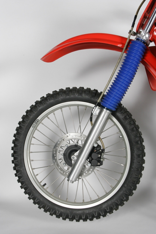 | The best thing about the front of the CR125R was the new disc brake. Compared to the mediocre drums on most of the competition, it was a huge advantage. The front KYB forks were decent performers overall, with good spring rates and slightly harsh action. They were not as good as the class-leading RM forks, but better overall than the confused KX and YZ front ends. Photo Credit: Stephan LeGrand |