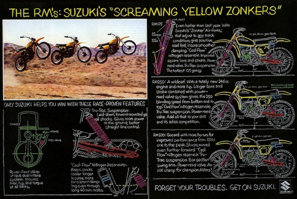 When I think of a seventies RM this is the one I picture. Guys like DeCoster and DiStefano made these bikes famous. While they may not have looked quite as trick as the monoshock YZ’s, for many people they were actually better bikes. |