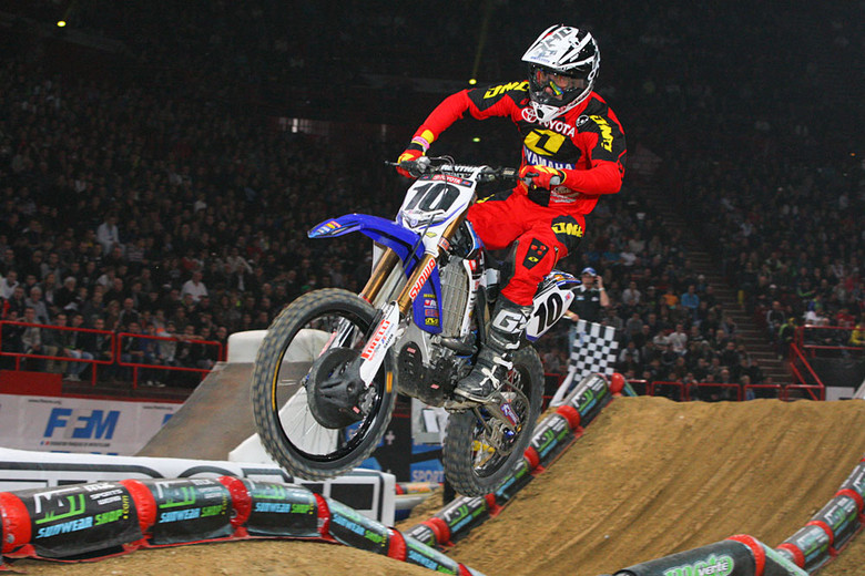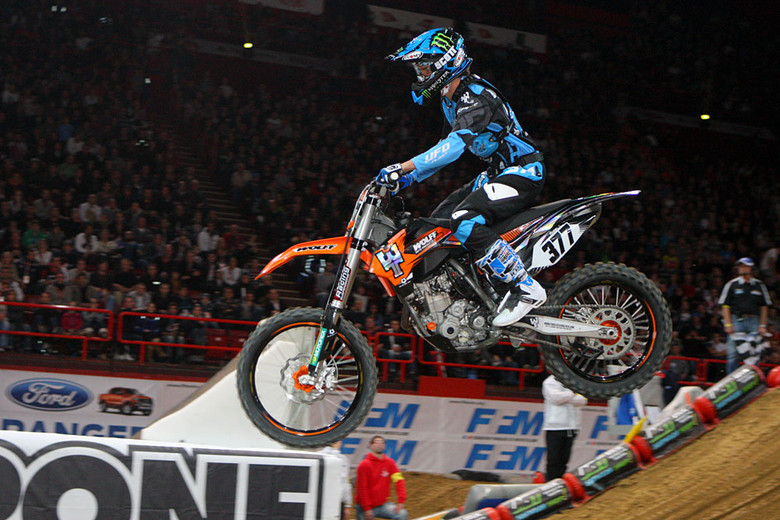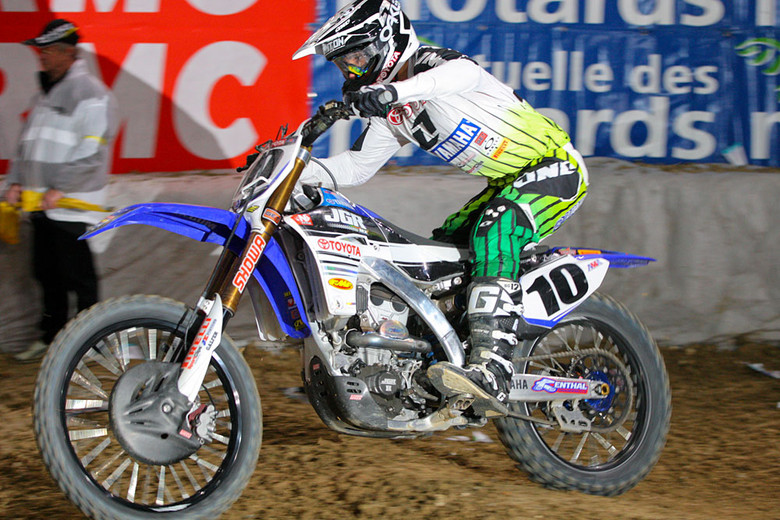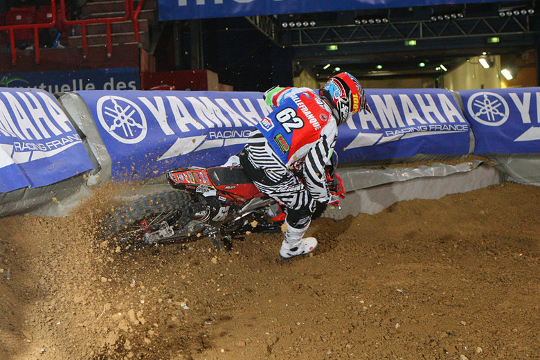 Christophe Pourcel showed up on a KTM 350 and crashed hard on Saturday night in the main knocking him out for the rest of the weekend. His bikes were stolen a week ago or so and this bike was pretty stock I guess. And it showed, he did win the heat race on Saturday but he looked bad in the whoops (maybe suspension wasn’t as good as the stolen stuff?) and also looked to get pretty tired. The fans sure loved him though but he was a shell of his sx-title-winning self at Bercy. Once he recovers from his injury, he’s heading to Florida to hang out for a while and maybe race, maybe not. Some European insiders think he’ll never race again on either side of the ocean.