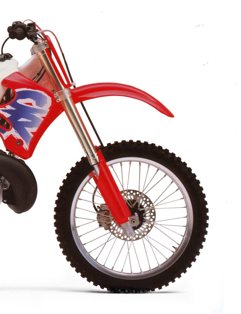 The Showa rear shock on the ’93 CR250R was nearly as poorly set up as its forks. The valving in the shock was badly suited to the rising rate of the linkage and would blow through the stroke on hard impacts. Adding to the misery was its lack of compliance on small chatter and braking bumps. Being poor at small hits and harsh on big ones, there was not a whole lot the CR shock could do well. On the bright side, the brakes on the Honda were world class in power and feel, far outclassing the CR’s competition in ’93. Photo Credit: Honda