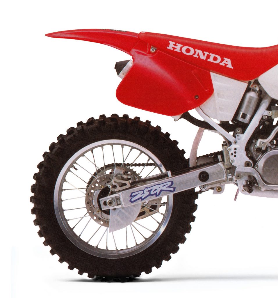 The 249cc mill on the ’93 CR pulled strongly from the first crack of the throttle, all the way until the rev limiter kicked in. It was broad, burly and badass. Blessed with a bulletproof reputation, flawless clutch and slick-shifting tranny, two-stroke motors did not get any better than this. Photo Credit: Honda