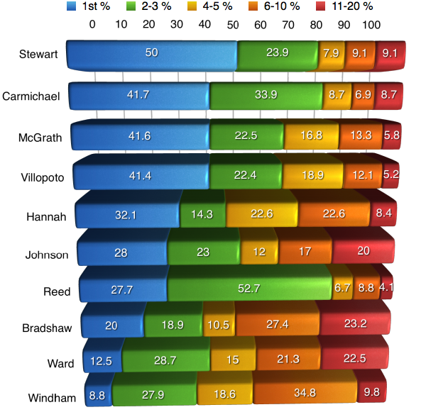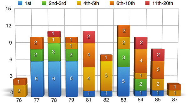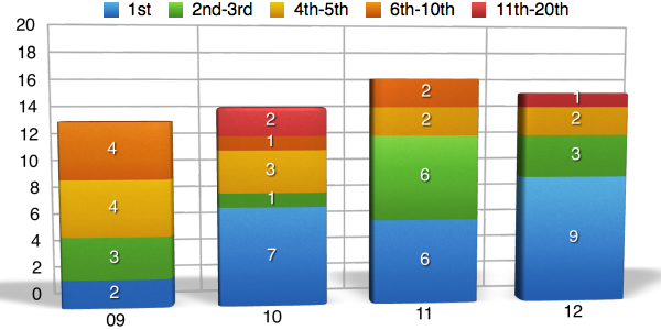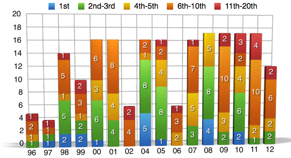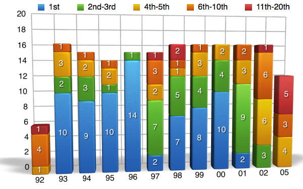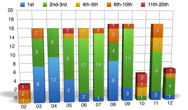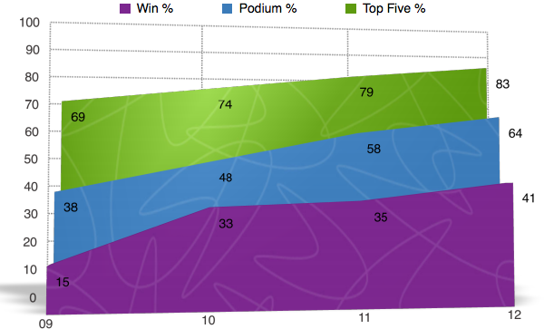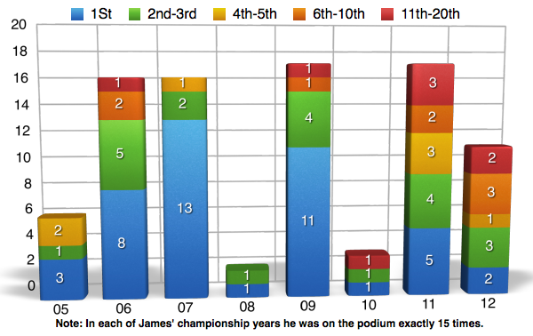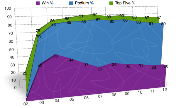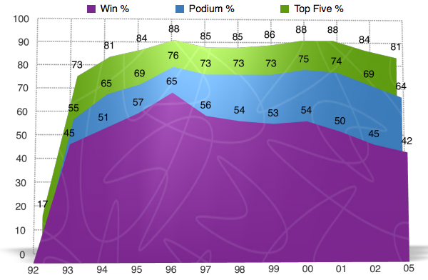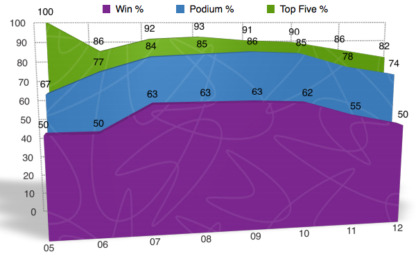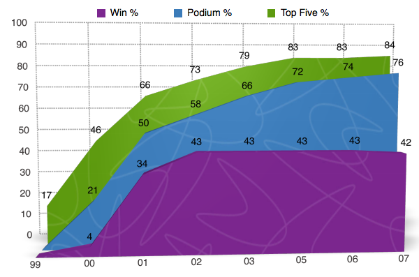 Oftentimes when we look at percentages and statistics, we view them as a whole. We look at a riders entire career and calculate the numbers from a huge span of time when in reality, we are not getting the whole story by doing it this way. For example, when you looked at the charts above and saw that James Stewart has a 50% win rate, you were probably pretty impressed. Yet what you most likely didn’t know is that at one point in time James’ win rate was as high as 63% and has been on the downfall since 2009. Here’s another one I bet you didn’t know. Let’s say that McGrath retired after the 2001 season when Carmichael really started showing that he was the dominate force. At the time McGrath still had 72 wins, but if he retired after that season he would have a 50% win rate instead of it being down near 42% when he ?nally hung up his boots for good in 2005. In the following charts I will go back in time and show you the win%, podium%, and top ?ve% for each rider throughout there career. They are NOT percentages from the given year, but instead they are percentages for the rider up to that point in time. I will also be separating the individual years into ?ve categories and showing you how many times the rider ?nished in each category.