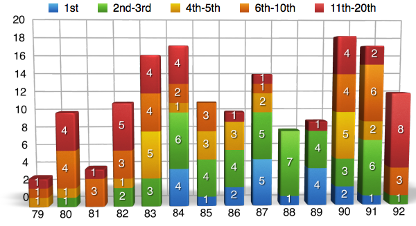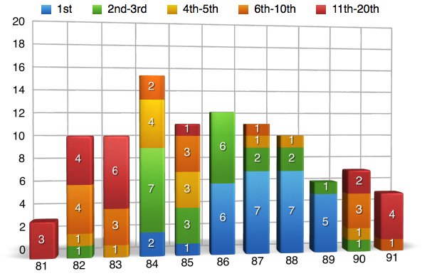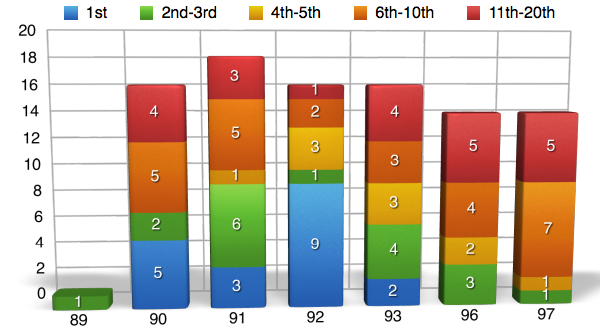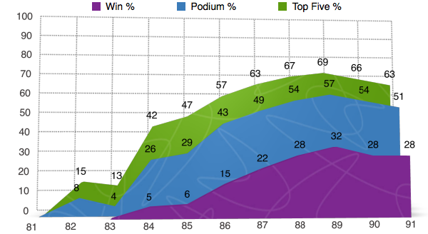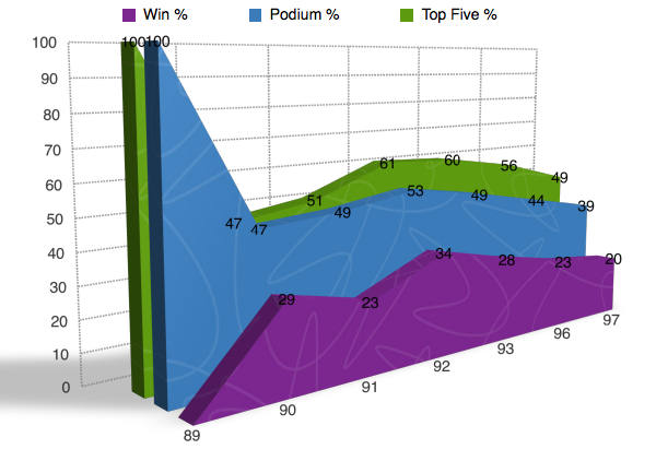 Now maybe Jeff Ward doesn’t have the best percentages and maybe he wasn’t the guy who blew the doors off everyone else back in the day, but Ward was a gamer and he was willing to do whatever it took to get the job done. While most of the guys around him were doing the whole, “win a few races then crash out, win a few races then crash out,” Wardy would just podium his way into title contention and most of the time it worked. He’s not on this list for nothing though and as you can see from the charts below Jeff still knew how to win races on a regular basis. Another thing you have to keep in mind when thinking about Ward is that by ’91 the guy was 30 years old and still winning races! In a time where some of the top guys were hanging it up in the 25-27 range, that’s an amazing statistic.