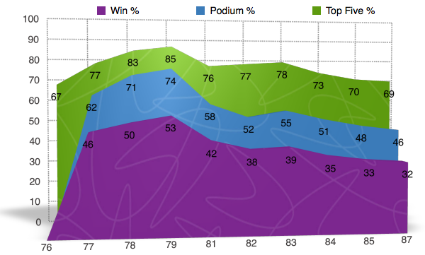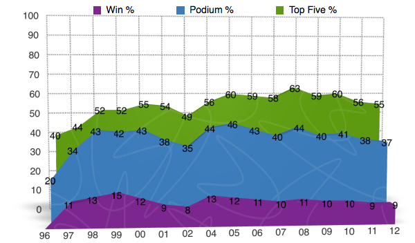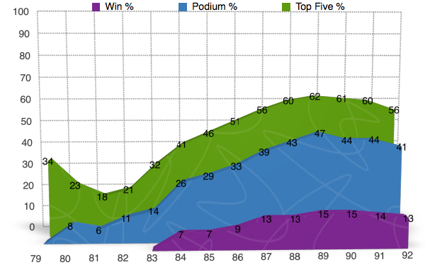 Again the percentages are NOT the riders % for the given year, but instead they are for the riders career after the said year was completed.