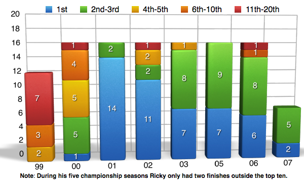 RC is one of the very few guys that was able to quit while still on top and because of that, his statistics are most likely a lot better than they would have been if he had stuck around for a few more years. Ricky took a huge jump up from to 2000 to 2001 in pretty much every area and from there his percentages would pretty much keep climbing for the rest of his career. In fact, even during his 2007 farewell tour his podium % and top ?ve % were still steadily on the rise. The only thing that slightly dropped off was his win % and that was to be expected. It’s also amazing how consistent RC kept his win percentage from 2002 all the way up until he retired. As we will see with a lot of the guys coming up, keeping your percentages on the rise or at least steady is very rare occurrence.
