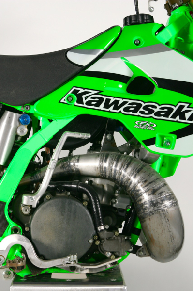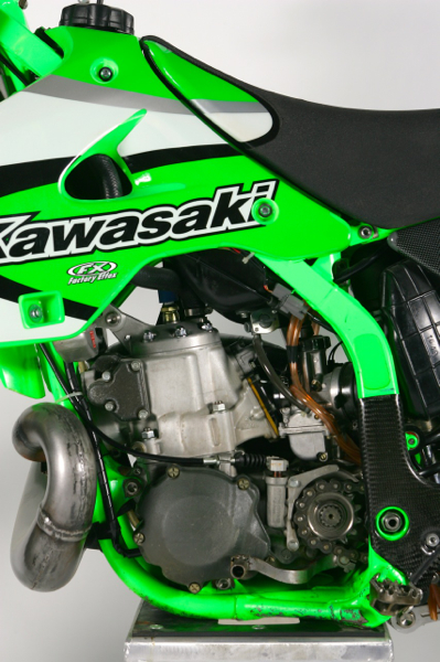 Unlike many other team’s “works” machines, Kawasaki’s SR factory bikes were not just run-of-the-mill production machines tarted up with some aftermarket goodies. These machines were hand selected in Japan by Kawasaki to be Factory racers and they receive special care at assembly. All the parts were painstakingly analyzed and matched to assure optimal performance. The cases were matched, the crank balanced and the frames checked and gusseted before being powder coated in florescent green. KHI (Kawasaki Heavy Industries) supplied the works cylinder, head and piston, which were then tuned by Rick Asch to suit each rider’s personal taste. |