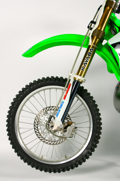 Huffman’s works KYB shock was machined out of magnesium to save weight, and featured a larger diameter than the stock shock shaft. The shock featured both high and low speed compression adjustments (which was very exotic at the time). The linkage was manufactured out of billet aluminum by KHI and could be swapped out to suit different track conditions. Even with all Kawasaki’s weight saving tricks, the ’98 SR250 tipped the scale at 228 pounds. At that weight, the SR was giving up over ten pounds to its’98 competition. (Swiz note: That is one wasted tire and I always thought these smooth rounded rims were ugggly.) |