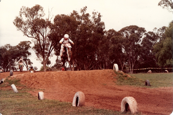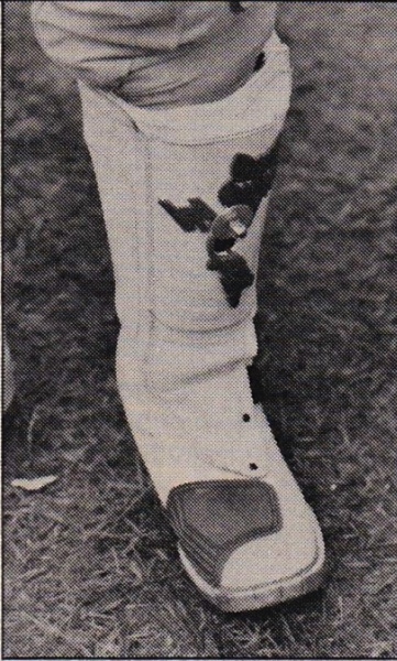 Ryan’s amazing victory was made all the more remarkable by the fact that he almost did not ride the race. The week prior to Daytona, Ricky had caught his knee in a rut and tore the ligaments in his left knee. In order to even try to ride the Daytona event, he cobbled together this crude knee-brace which used a bolt drilled through the front of his Fox Comp-2 boot. |