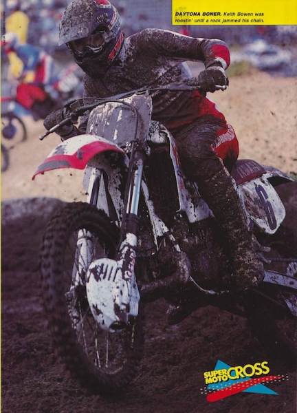 At the drop of the gate, Ron “The Dogger” Lechien would rip out of the gate and somehow wheelie his Factory Kawasaki 90% of the way to the first turn. Ronnie’s lead would be short lived, however, because when he finally dropped the front of his SR250 into the black Daytona muck, the front wheel would come to an immediate stop. As Lechien was executing a perfect over-the-bars dismount, Rick Johnson would plow into the back of his Kawasaki and end up in a muddy heap. Taking advantage of all this carnage would be the #12 of Ricky Ryan. Ryan would lead the field into the first turn, followed by Rodney Smith and Keith Bowen. Before the first lap was over, the muddy track would claim the last of the big players. Jeff Ward would suffer a derailed chain, ending his bid for a first Daytona SX victory.