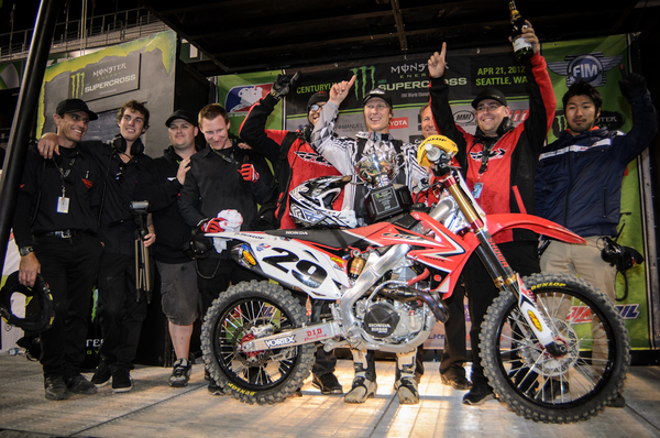 After following Short for the first few laps, the blazing fast German started to apply pressure to the veteran from Colorado. Perhaps because of his comfort riding with Kenny, Shorty never flinched and continued to hold off the KTM rider. At the halfway mark, Roczen actually squeezed past Shorty’s Honda for the briefest of moments, but Andrew pulled right back past with a well planned slingshot down the next straight. From there, #29 was not challenged, and rode away to an emotional, first Supercross win.