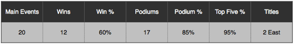 [ Titles + (.5 x Wins) + (.1 x Podiums) ] x .01[ Win % + (.25 x Podium %) + (.1 x Top Five %) ]