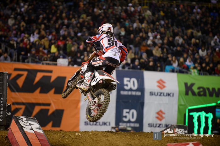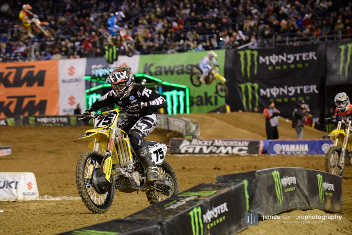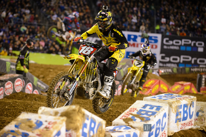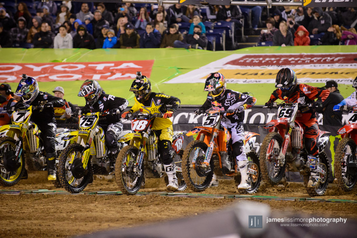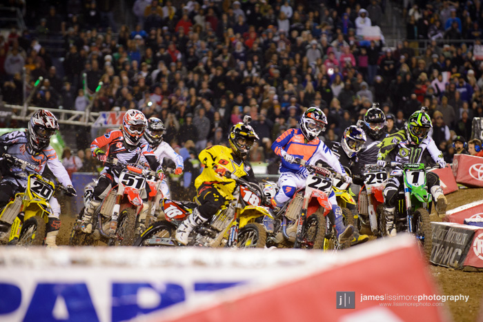 | First turn of the 450SX main event and although RV looks to be fine here, he did have a few issues in the next couple of turns and ended up pretty far back. Millsaps’ starts have been on point all year long. |