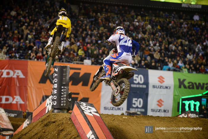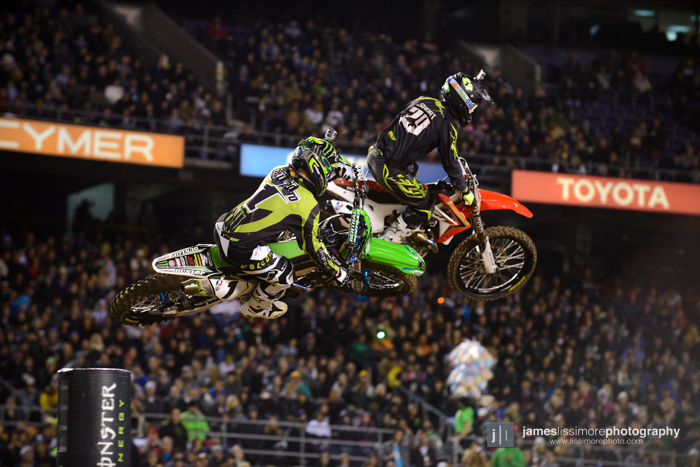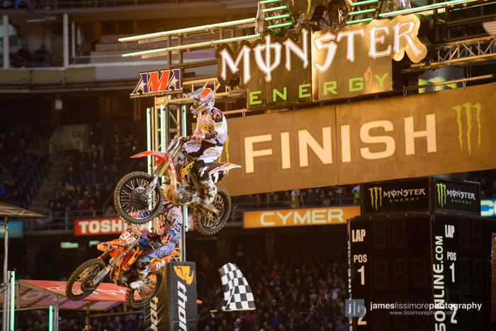 | Tomac and Roczen were this close at the end of the main event. Not sure if Eli knew that Kenny was coming or not but it was a lot closer than Tomac and GEICO would’ve liked, thats for sure. No matter, Tomac moved three points closer to Roczen. |