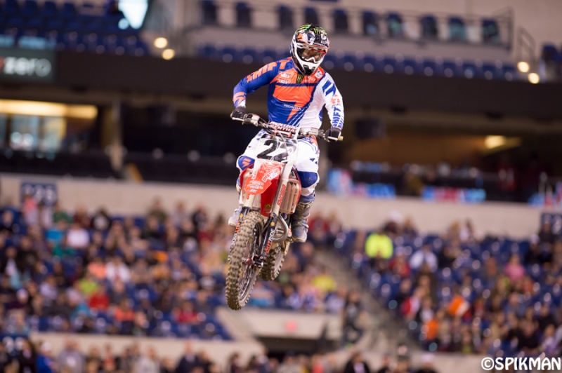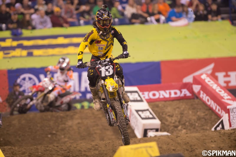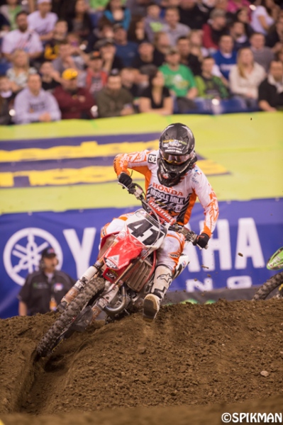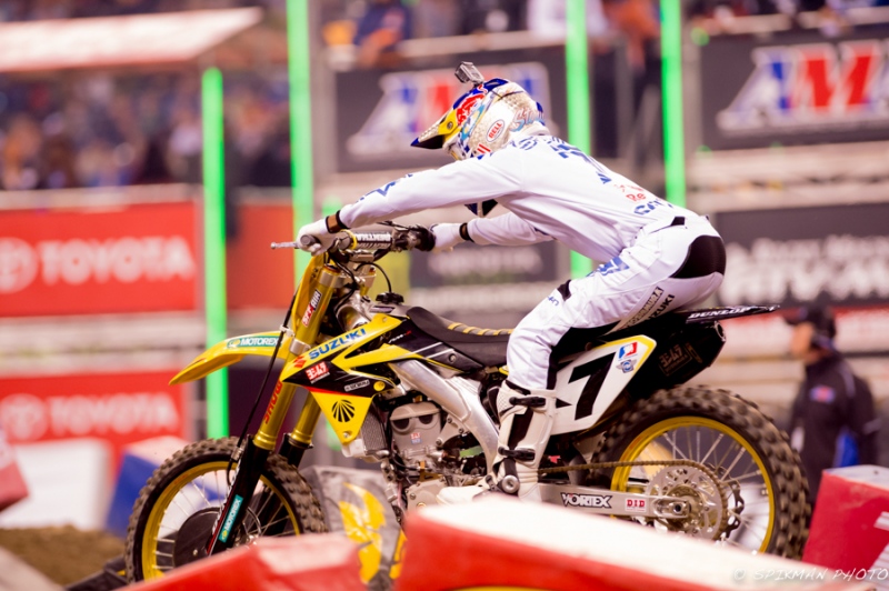 Dean Wilson’s terrible run of bad luck hit it’s pinnacle in Indy. His year began with his 450 team and contract absolving right out from under him with only weeks left prior to the start of the 2013 season. He was forced to jump back on the 250 and reassess his game plan for the Supercross series. Every Supercross series Dean has entered, he has been at the top of the list for title hopefuls. This year was no different and following Dallas, it looked like it really could be the foregone conclusion of the series. Who would finish second? Because Dean was clearly going to handle this coast. Crashes during weekly preparation lead to a battered body and struggles during the races. Each week the question was “will Dean regain his rightful spot atop the podium this week?”. But the hurdles created by his stressed body and the solid riding by both Wil Hahn and Marvin Musquin of late, made it all for naught. The first lap of Dean’s heat race was the proverbial nail in the coffin on his series and 250 career but hopefully not his year. It’s crazy to think about Dean Wilson with all his natural skill in Supercross, yet no title after 4 years. He was a favorite and in the fight every year but in the end, no reward when the gavel fell. Cruel.