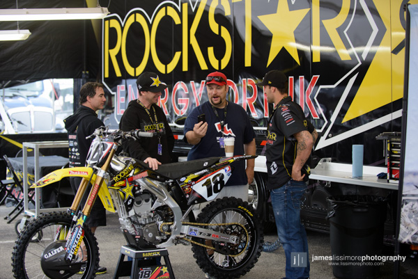 | Early on it was all smiles for James Stewart and his Suzuki crew as they went out for track walk. |