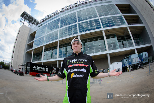 | Dean Wilson, unable to fly due to his lung injury, drove with his dad out to Houston to take the festivities in. And pose for Lissimore’s camera in a way that makes it seem that he owns the stadium. |