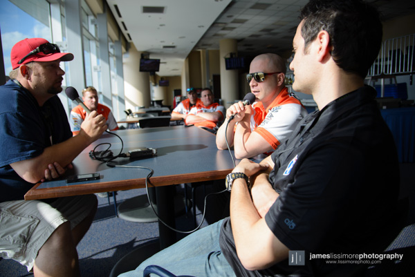 | Here’s Weege, JT and I doing our pre-race EKS Brand Goggles Pulpcast. Those dudes in the team shirts are JT’s VIP’s watching three idiots talk into a mic. |
