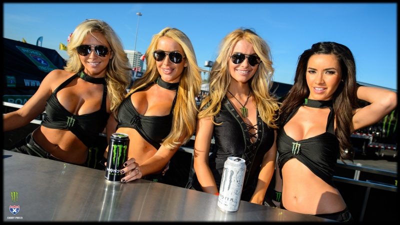 Moser – Sorry Blazier you are way off base, sure the Red Bull girls in plaid shirts are cute, I’d certainly buy some peaches from them on the side of the road, I’d probably even tip them, but they are forgettable. Do you know even one Red Bull girl by name from memory? Even better, do you know any other girl promoting a product in the pits by name besides the Monster Girls? The Monster Girls are the Factory Honda of energy drink girls, they are the best “equipped” and will spare no expense on aftermarket parts to continue their rein of superiority. To use the man strength/boy strength analogy, the Monster Girls are real women (disclaimer not all parts of them are real) and the Red Bull girls are still in training bras. With the scarce amount of material used in these Monster Girl outfits it’s nothing short of amazing that Kelly Louche (she runs the agency that supplies the Monster Girls) continues to find new ways to reveal more skin year after year. Hangout in the pits at a Supercross race and watch the rubber necking and jaw dropping that occurs when people walk past the Monster Girls usually followed by a guilty look, some pants adjusting and nervous sweating. The blue balls standard of energy drink girl hotness is the Monster Girls, stamp it.