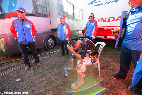 …he was tricked by a shadow and lost touch with his Geico bike as he crested this jump just as he was planning to make his move. Many likened this crash to Chad Reed’s Millville ejection initially but it felt more like RC at Washougal in ’06 upon further reflection. |