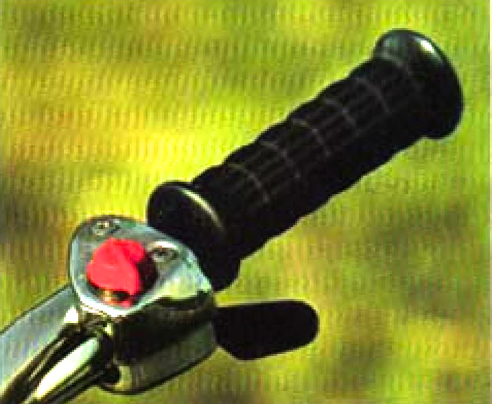 While most race bikes of the era used a whirlpool twist throttle, the POS used this trick thumb activated accelerator to fight arm pump. The red switch was used to engage the third gear powerband.
