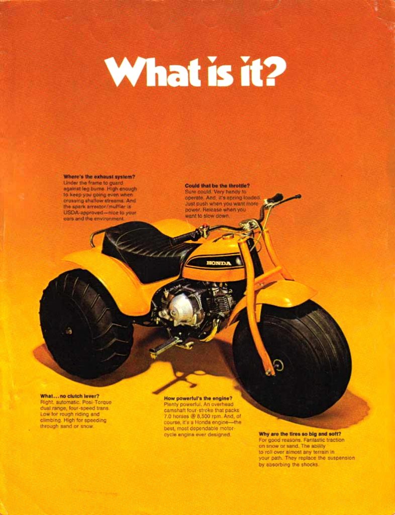 For Honda, the US90 (The name would be changed to ATC90 in 1971) would be an incredible hit from the very start. The addition of a third wheel for stability and the employment of specially made “high flotation” tires gave the all-new ATC an incredible advantage in the sloppy and slippery conditions that made life difficult on a traditional motorcycle. It was easy to get on and ride for complete beginners and appealed to riders who were intimidated by two-wheeled machines. Throughout the seventies, the demand for Honda’s new invention continued to grow and by the end of the decade, was dwarfing the production of their off-road two-wheeled machines.