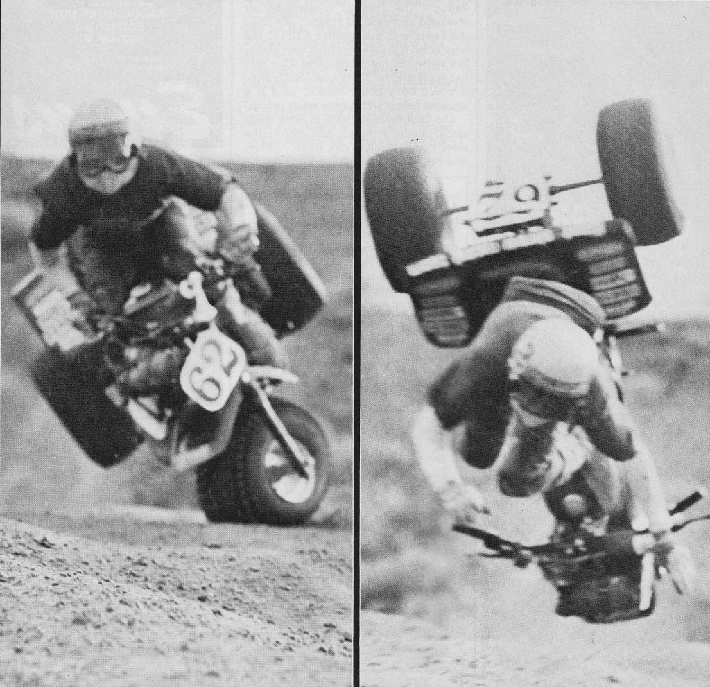 Once testing was underway, it became apparent that the Tri-Moto was carrying too much weight over the front wheel. This was causing a dangerous huck-a-buck in the whoopties that was leading test riders to be ejected over the bars at an alarming rate. Here Yamaha testing ace Wally Whoop-De-Doo nails a perfect triple-auger-lawn-dart dismount on the POS prototype.