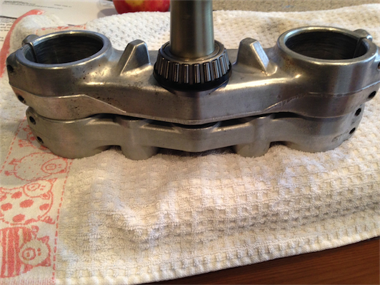 Cleaned up the clamps and with the help of Tony Berluti’s press, I put a new bottom bearing on. I ordered new top and bottom bearings aftermarket and they look great. Same with the swingarm bearings and linkage bearings. Oh yeah, I also ordered an aftermarket bolt kit to replace all the ones that were beat down. All this stuff was ordered from BTOSports.com using the “pulpmx” code. We almost had a big issue when I took the linkage apart and the bottom shock bearing just fell out.