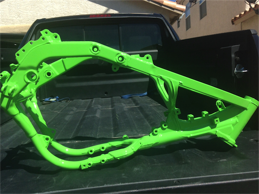 So the bike was stripped down in the last installment so then the next step was powder-coating. I went on-line and found a place by the house that did the frame and subframe for $240 so that wasn’t so bad. I went and found the Kawasaki green paint code and when I went down there I told them that was what I wanted the color to be. The girl was like “Why don’t you want it Kawasaki green?” so which I told her that I thought that was the code I gave her. She said no, that’s close but it’s not Kawasaki green. She showed me the two samples and yes indeed, the Kawasaki green was a perfect match the frame as opposed to my color code that was a bit brighter. Who knew?
