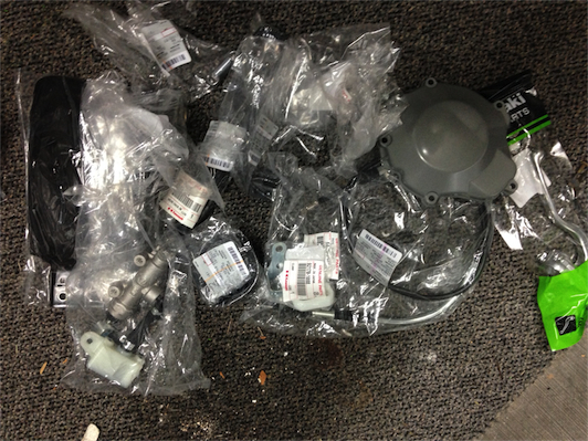 The “knuckle” part of the link where the shock bolts to had a big chunk missing out of it and it was big enough where the only thing holding it together was the bolt. So no big deal, I ordered a replacement one and waited for it (I was going to press all new bearings in) when I was informed that Kawasaki discontinued it. Crap! I didn’t know what I was going to do- get it welded and smoothed out I suppose- but then I went on eBay and to my amazement there was a complete 1990 Kawasakl KX250 linkage for sale on there for $100. How lucky am I? Yeah it’s in Great Britain but so what? That was pretty sweet right?