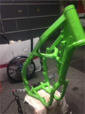 I get a few people asking me if I was going to powder-coat it flo-green “like the factory bikes” and to that I say…”C’mon people, Kawasaki didn’t go to flo-green until 1996 on the factory bikes and so a 1990 with flo-green paint would look ridiculous”. And I know this because as a privateer Kawasaki mechanic in 1997 I had to try and get my frames flo-green so we looked factory.