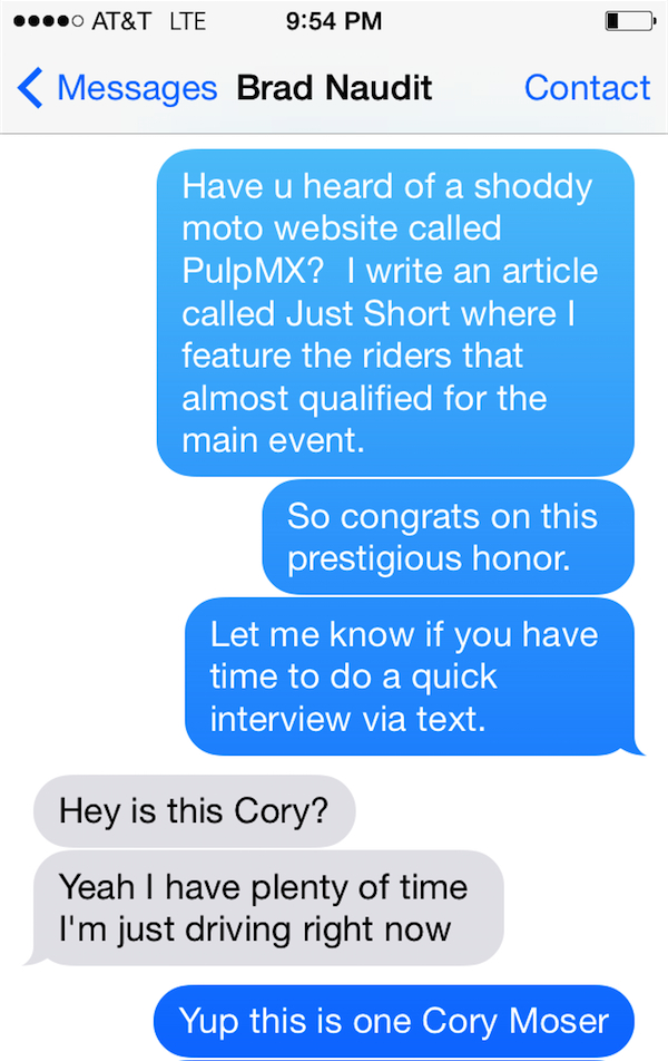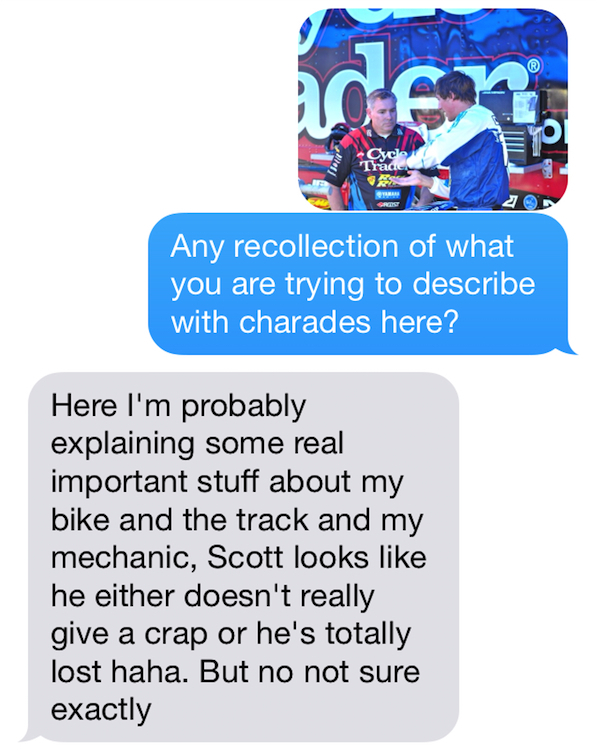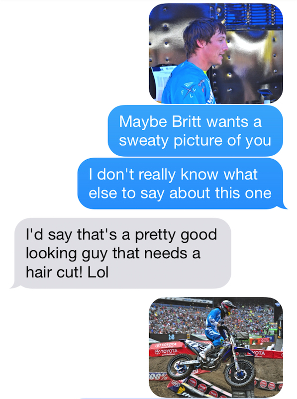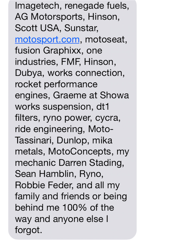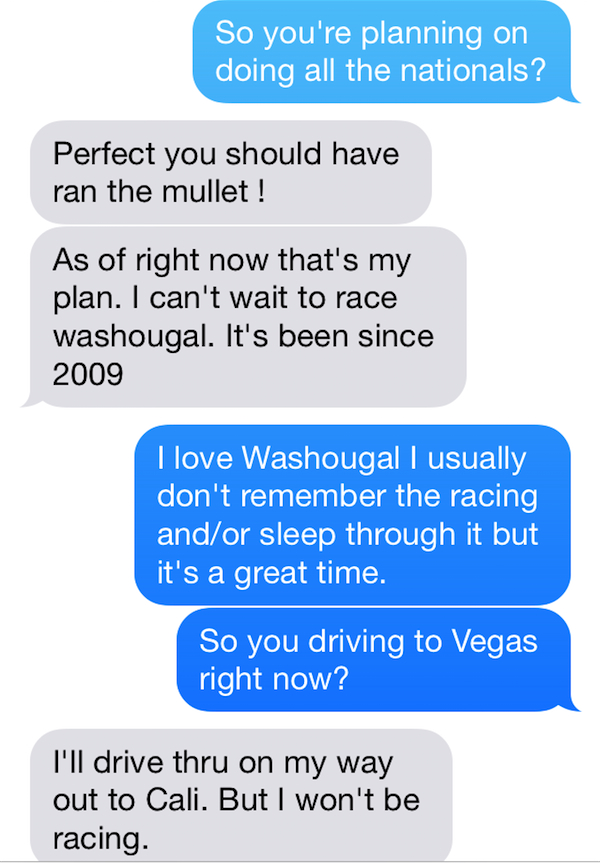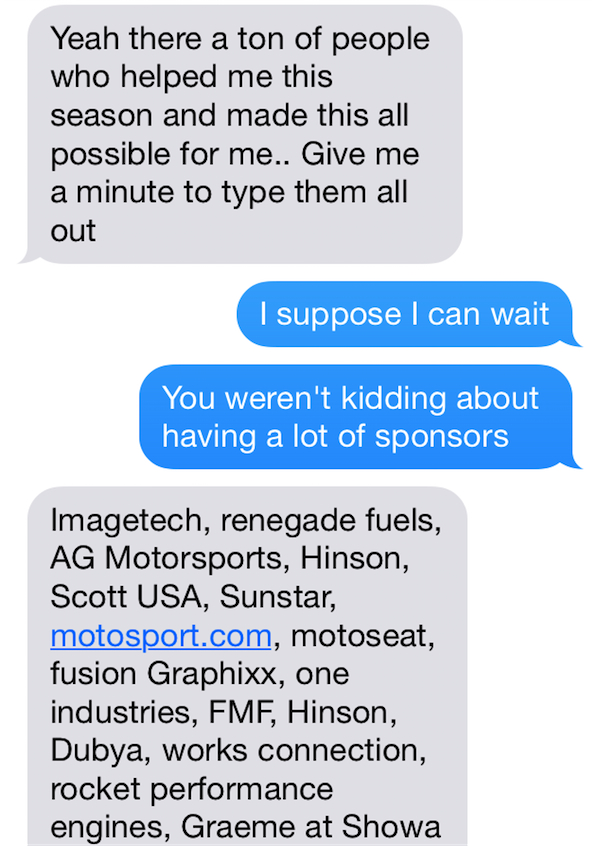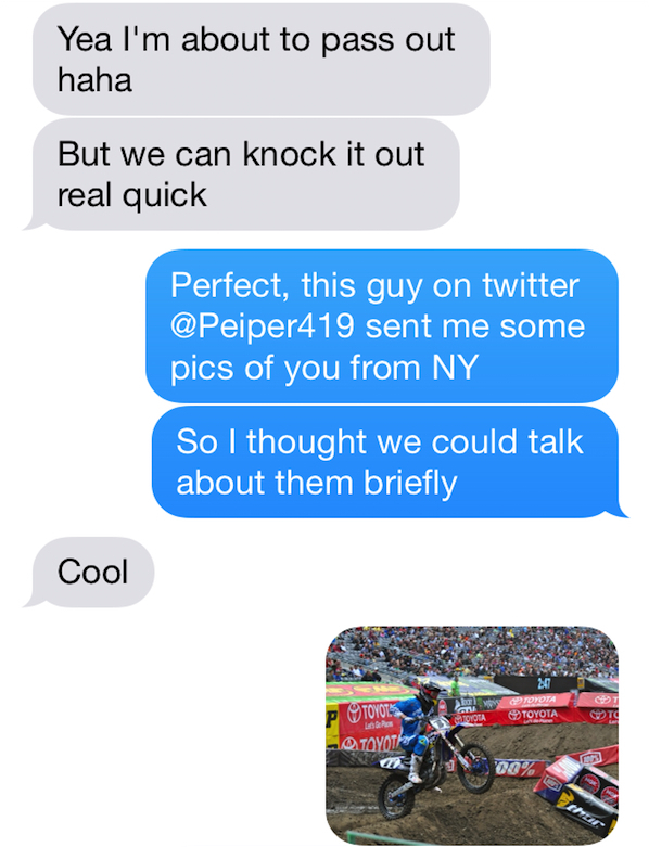 Chiz is always a good sport and tolerates my “unique” approach to interviews and writing. A PulpMX fan named Terry, from the New York area, sends me pictures of the races he attends. He’s provided me with a lot of material for my Shorty spank bank, and I’m very grateful for that. He also had some pictures of Chiz from this weekend, so I texted them to Chiz to get his thoughts. Thanks Terry for the pictures, and please follow him on twitter @Peiper419.