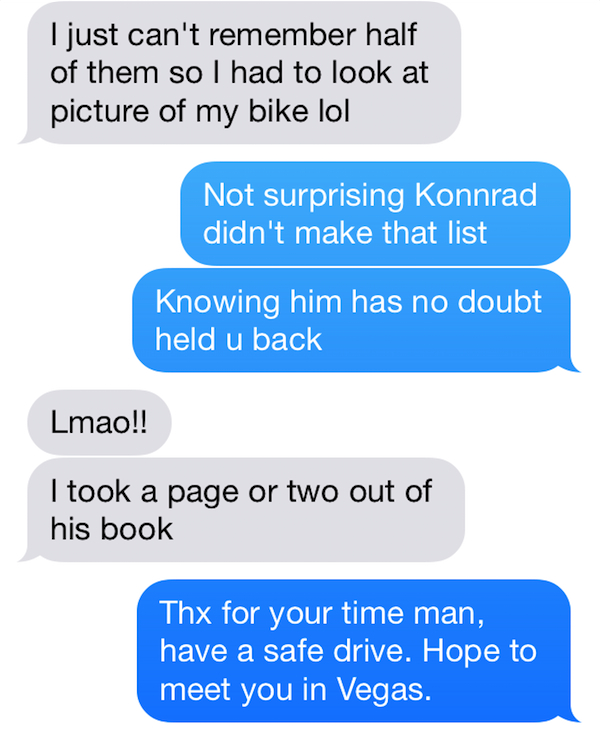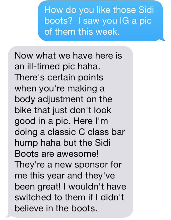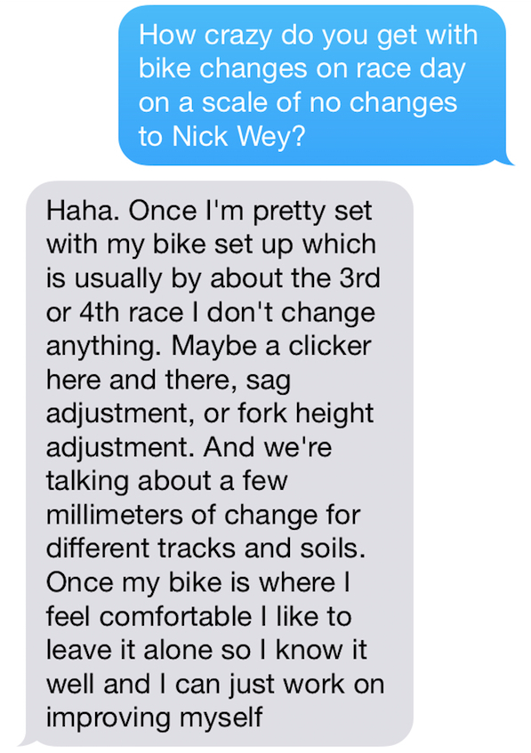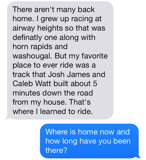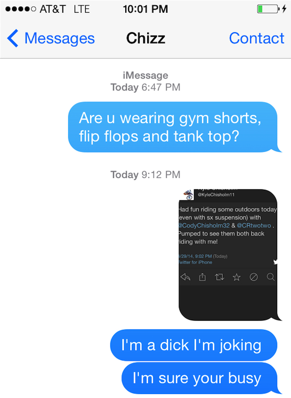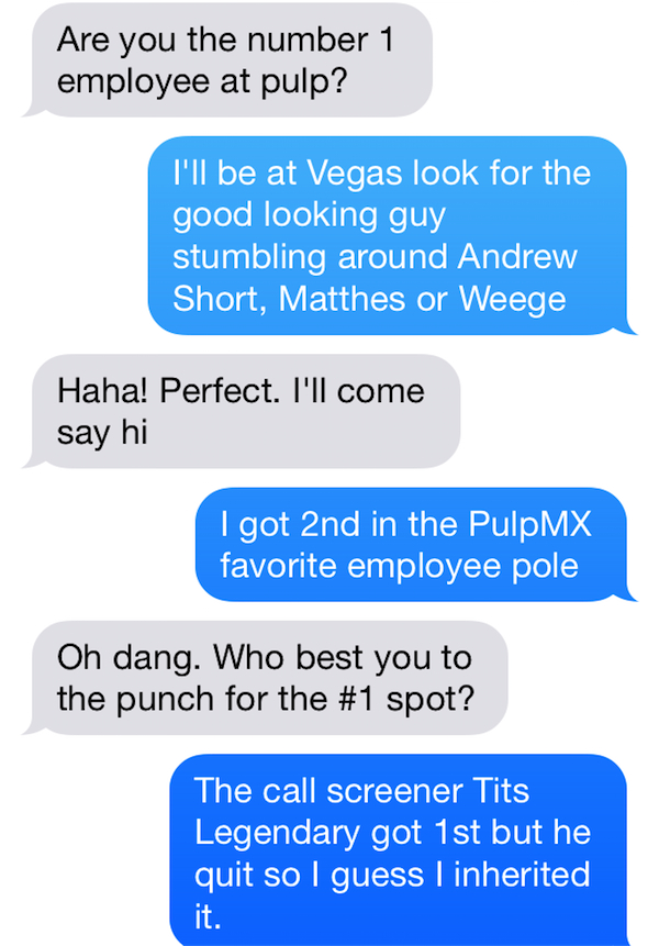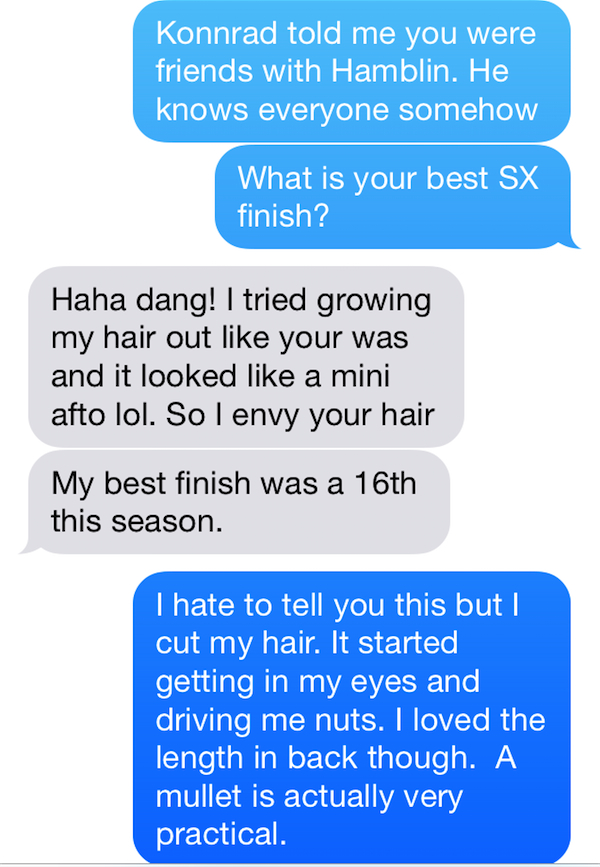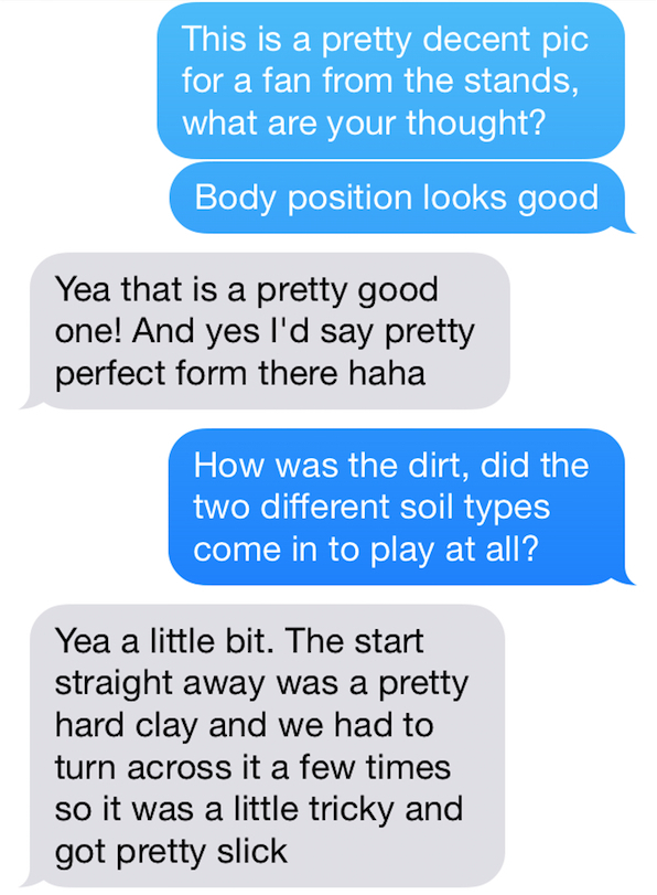 Chiz is always a good sport and tolerates my “unique” approach to interviews and writing. A PulpMX fan named Terry, from the New York area, sends me pictures of the races he attends. He’s provided me with a lot of material for my Shorty spank bank, and I’m very grateful for that. He also had some pictures of Chiz from this weekend, so I texted them to Chiz to get his thoughts. Thanks Terry for the pictures, and please follow him on twitter @Peiper419.
