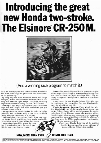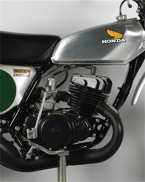 One interesting bit of trivia about the CR250M, is that Honda actually considered leaving the iconic Honda wing off entirely. Early on, it was thought by some in the company that the name Elsinore (named for the famous Elsinore GP) would carry more cache with racers than the name Honda, which was known primarily for its friendly street bikes. By the time the Elsinore made production, the iconic wing was back on the tank. |