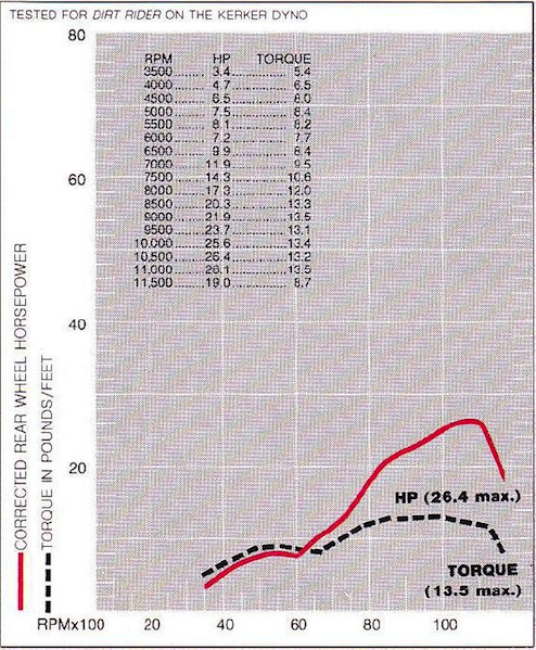 Power profile: On the dyno, the 1986 YZ125 pumped out the most peak horsepower of any 125. On the track, however, its short spread and notchy gearbox gave way to the superior torque and flawless delivery of the ‘86 CR125R.