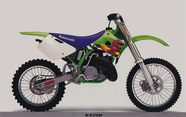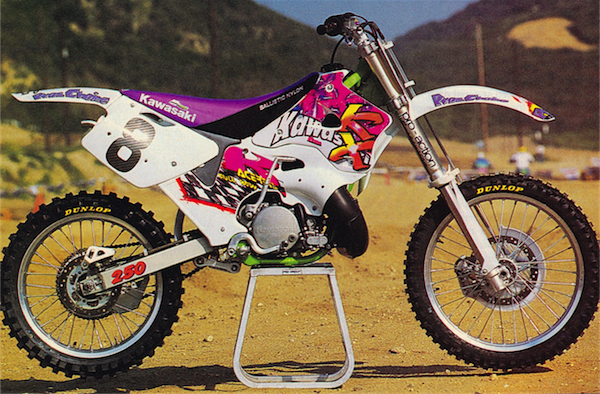 Here is another example of the ill-fated full bodywork revolution. This KX250 started out as probably the most tasteful machine of ’95 and ended up as this pink, purple and white mess. Even without the terrible body panels, this would have been pretty ugly, but when you tack on those turkeys, you peg the fugly meter straight to eleven. |