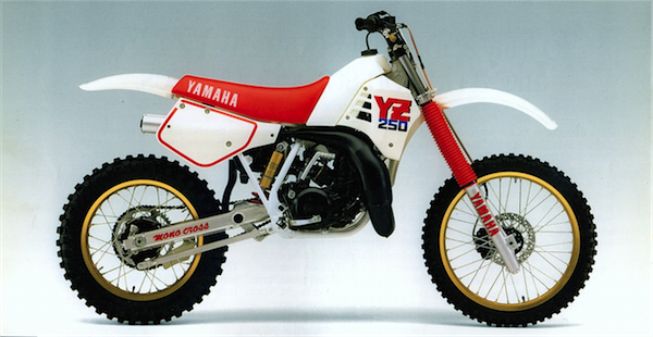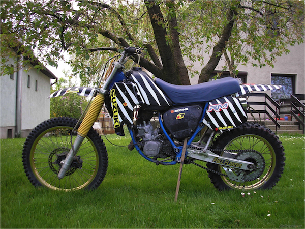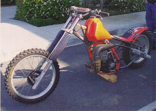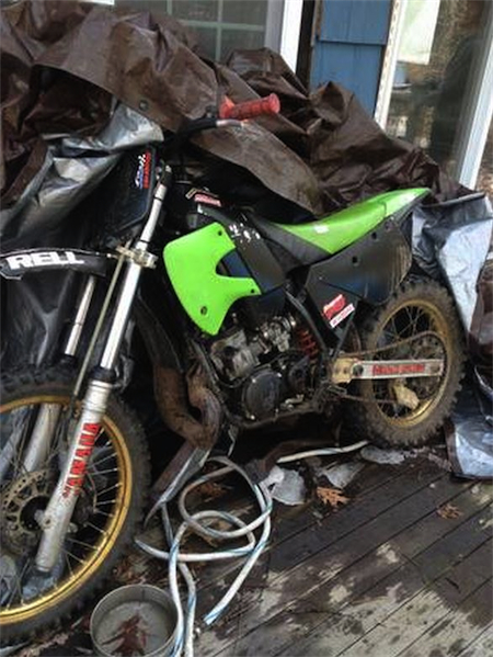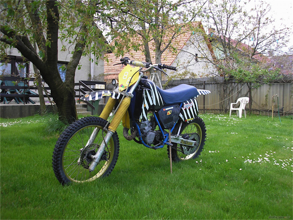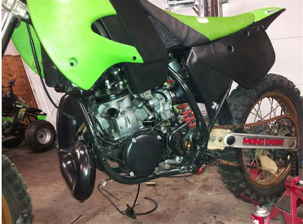 When I first saw this beauty, I had to admire the impressive vision it takes to see an 1987 YZ250 and a 2001 KX100 and think “perfect match!” I mean, who thinks of this? Do you just happened to have YZ and KX laying around and figure “why not?” Maybe the guy was just a huge Monster Energy fan and wanted to look just like RV? If so, I say mission accomplished! |