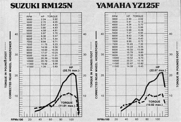 Power picture: On paper, the 1979 YZ125F offered the most peak power of any production 125, but that did not tell the true story. One look at its torque curve shows why it lost out to the RM. After its solid punch in the midrange, the YZ went flat for 2000 rpm, before picking back up near redline. This flat spot made the YZ feel peaky compared to the broad power of the RM125. |
