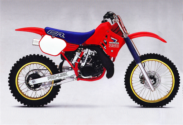 Here we have a perfect example of the Mutant Bike in all its glory. At first blush, this appears to be little more than a tired and slightly abused 1989 Honda CR250R, but if you look more closely, you will see that this machine is actually a bit of a Frankenstein’s monster. For starters, this is not a ’89 CR at all; it is actually an ’86 model. The rear drum brake is the giveaway, as is the odd fit of the low-boy pipe and silencer, which were never intended to be used with this frame. The tank also does not seem quite right and sits too high in relation to the motor. The cheesy Ceet Racing seat, however, is period correct and looks just about as bad now as it did in 1989. As always, the de rigueur bald knobbies are present (with a sticker that big, you would think Dunlop would hook a brother up), as is the ubiquitous sun-faded (and spray painted) plastic. |