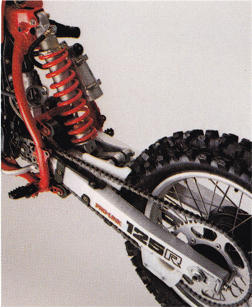 On the track, the little Honda’s suspension worked well for anyone less than 160 pounds. The rear end was plush and took small hits well, but could be bottomed with a “thud” on big hits. In these situations, the bike took the hit well and never hopped, bucked, or did anything weird. For heavier guys, a step up in spring rate and perhaps even an aftermarket alternative were recommended. Overall, the CR’s shock was much improved and certainly the best ever seen on a 125 Honda, but still not in the same league as the omnipotent Suzuki Full-Floater.