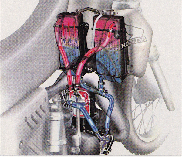 One significant change for ’83 was the incorporation of an all new coolant system for the CR125R. The new system lowered the center of gravity by moving the radiators a full two inches lower on the chassis and also narrowed the motor with a redesigned water-pump that was both lighter and more compact. |