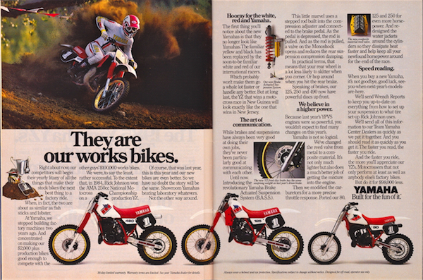Yamaha’s 1985 ads proudly proclaimed that their team actually raced what they sold on the showroom floor.