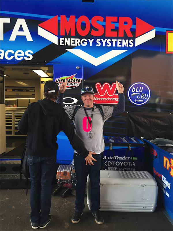 21.Stop by the JGR team to see how my name looks on the truck. Try to convince them to let me wear the wiener suit around the pits. They like the idea but they only have a little wiener with them, I’m a good actor but not good enough to be a small wiener, so I settle by putting one in my mouth instead.