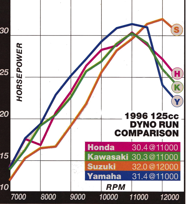 The new blue YZ pumped out a super wide, almost 250-like spread of power. Torque off the line was excellent and followed by a strong mid-range blast. Top end power was solid and strong, but not as eye-watering as the shrieking Honda CR125R. The YZ did its best work in the middle, but it was happy to be torqued or revved, as conditions warranted. It was capable of pulling the next gear when short-shifted and offered by far the widest power spread in the 125 class. From 7000 rpm to 11,000 rpm (the bread and butter of a 125 power curve) the Y-Zed smoked the competition, pulling out as much as a three horsepower advantage. It was only at the rev limiter where the YZ gave way to the competition. In 1996, this was the ultimate 125 motor.