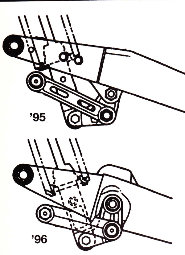 A new linkage for ’96 repositioned pivot point to the middle of the swingarm and finally cured the droopy rear end that riders had complained about since 1993. |